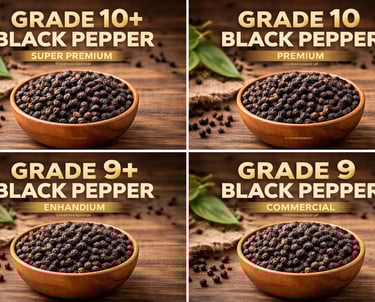 Indian black pepper in premium export grades 10+, 10, 9+, and 9, ensuring bold size, rich aroma, and reliable quality.