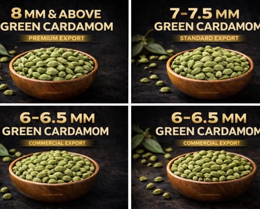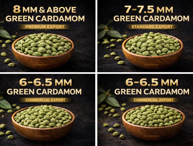 Premium Indian green cardamom in sieve-graded sizes from 8 mm & above to commercial grades, delivering natural color, aroma, and export consistency.